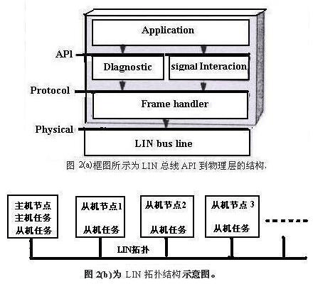 針對汽車應用的LIN 1.0(本地互連網絡)和LIN 2.0總線系統,它的目標是低成本應用,除了TPMS外還有電動門、電動窗、側鏡、雨刮器、座椅安全帶報警、外部照明等。LIN總線的傳輸速度最大為 20kbps,而且它在單通道總線環路中最多能支持16個節點,總線電纜的長度最多可以擴展到40米。LIN足一種基于通用SCI(UART)字節接口的單線串行通訊為協議。圖2(a)框圖所示為LIN總線API到物理層的結構。而LIN總線的主要特征為:—個主節點、多個從節點的概念,無需總線仲裁;低成本:基于普通UART/SCI接口硬件;自同步,在從節點中不用晶體振蕩器或陶瓷振蕩器時鐘;保證信號傳輸的延遲時間;低成本單線實現連接;速度高達 20kbps;基于應用交互作用的信號;LIN總線的驅動/接收器規范遵從IS09141標準。