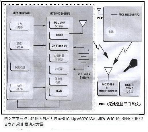 圖3左虛線框為輪胎內的壓力傳感器IC和發送IC為freescale公司的Mpxy8020A6或Mpxy8040A芯片和 MC68HC90RF2芯片。 Mpxy8020A6它內含壓力傳感器、溫度傳感器、電源控制和電池電壓檢測,喚醒功能的定時器,屬表面微機械CMOS加工工藝,SSOP封裝;而UHF 發送器+MCU(Flash)的MC68HC90RF2內含為2K用戶FLash ROM,定時器,集成的射頻(RF)發送器,低電壓檢測和RAM及內部時鐘發生器。則整個圖3左虛線框為Mpxy8020A6A與MC68HC90RF2 合成的遙測模塊示意圖。其圖3右側MC33591為UHF接收器內含鎖相環(PLL)超高頻開關鍵控(00K)接收器;MC912DP256 接收端控制器內含256KFLash,12KRAM,4KEEPROM,up to 5CAN,1xJl850,256MHz工作須頻率。