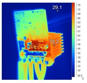 在圖中您可看到頂側冷卻的有效性,其中PCB上觀察到的最大溫度(功率塊底殼之下)與散熱器溫度之間的差異小于11°C。熱量傳導良好,并通過模塊電源的頂部冷卻金屬焊盤分配到頂側散熱器。頂側和底側FET之間的熱量共享,在單相或三相逆變器中,頂側和底側MOSFET的損耗可能不同。這些損耗通常取決于脈寬調制拓撲的類型和工作占空比,不同的損耗導致頂側和底側MOSFET的加熱不同。
