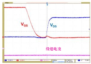 上圖所示為由于電路寄生效應引起的具有分立MOSFET的相位節點電壓振鈴,使用模塊電源時,具有連接兩個MOSFET的開關節點夾將高側和低側MOSFET之間的寄生電感保持在絕對最小值。在同一封裝中使用低側和高側FET可最大限度地減少PCB寄生,并減少相節點電壓振鈴。使用這些模塊電源有助于確保平滑的驅動MOSFET開關,即使在電流高達50A時也不會出現電壓過沖,如下圖所示。