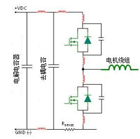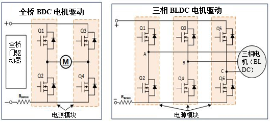 為在兩個方向上驅動BDC電機,您需要使用兩個半橋(四個金屬氧化物半導體場效應晶體管(MOSFET))組成一個全橋。要驅動三相BLDC電機,需要使用三個半橋(六個MOSFET)組成一個三相逆變器。 使用TI的采用堆疊管芯架構的CSD88584Q5DC 和CSD88599Q5DC模塊電源(小型無引線(SON),5mm×6mm封裝),您可通過兩個模塊電源和只帶三個模塊電源的三相BLDC電機在兩個方向驅動電機,每個模塊電源連接兩個MOSFET(高側和低側MOSFET),組成一個半橋。如下圖所示。