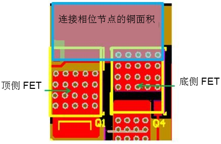 上圖所示為將頂部和底部分立MOSFET并排連接時的銅軌道,這是可將電機繞組連輕松連接到PCB的常見布局之一。連接相位節點的銅面積的長度為寬度的兩倍(軌道寬度取決于電流,軌道寬度通常受電路板的外形尺寸限制)?;蛘吣梢陨舷屡帕许攤群偷讉确至?/span>MOSFET,保持在相位節點之間。但是由于需要提供將電機繞組連接到相位節點,您可能無法減少軌道長度,并且這種布置可能不適合所有應用。