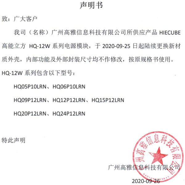 我司(名稱)廣州高雅信息科技有限公司所供應(yīng)產(chǎn)品HIECUBE高能立方HQ-12W系列模塊電源,于2020-09-25日起陸續(xù)更換新材質(zhì)外殼,內(nèi)部功能及外部封裝尺寸均不作修改,按原規(guī)格書使用。
